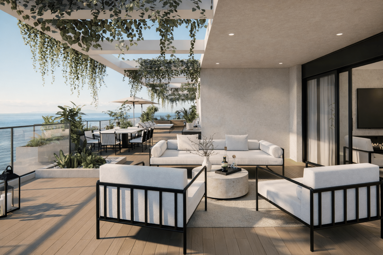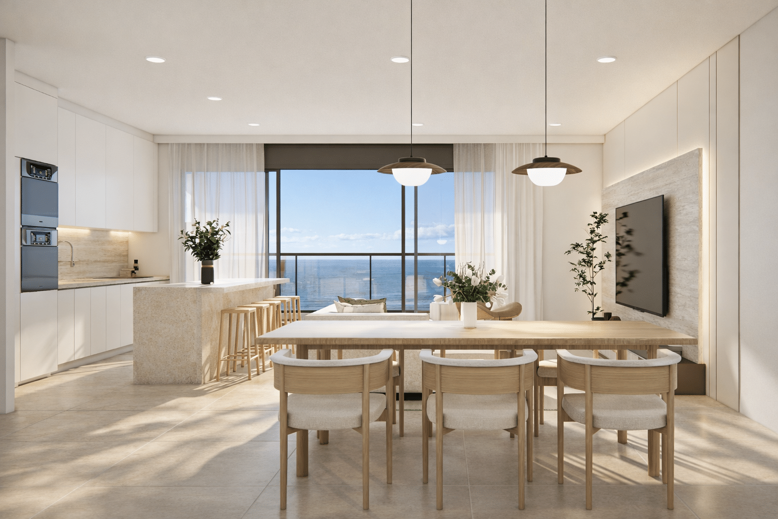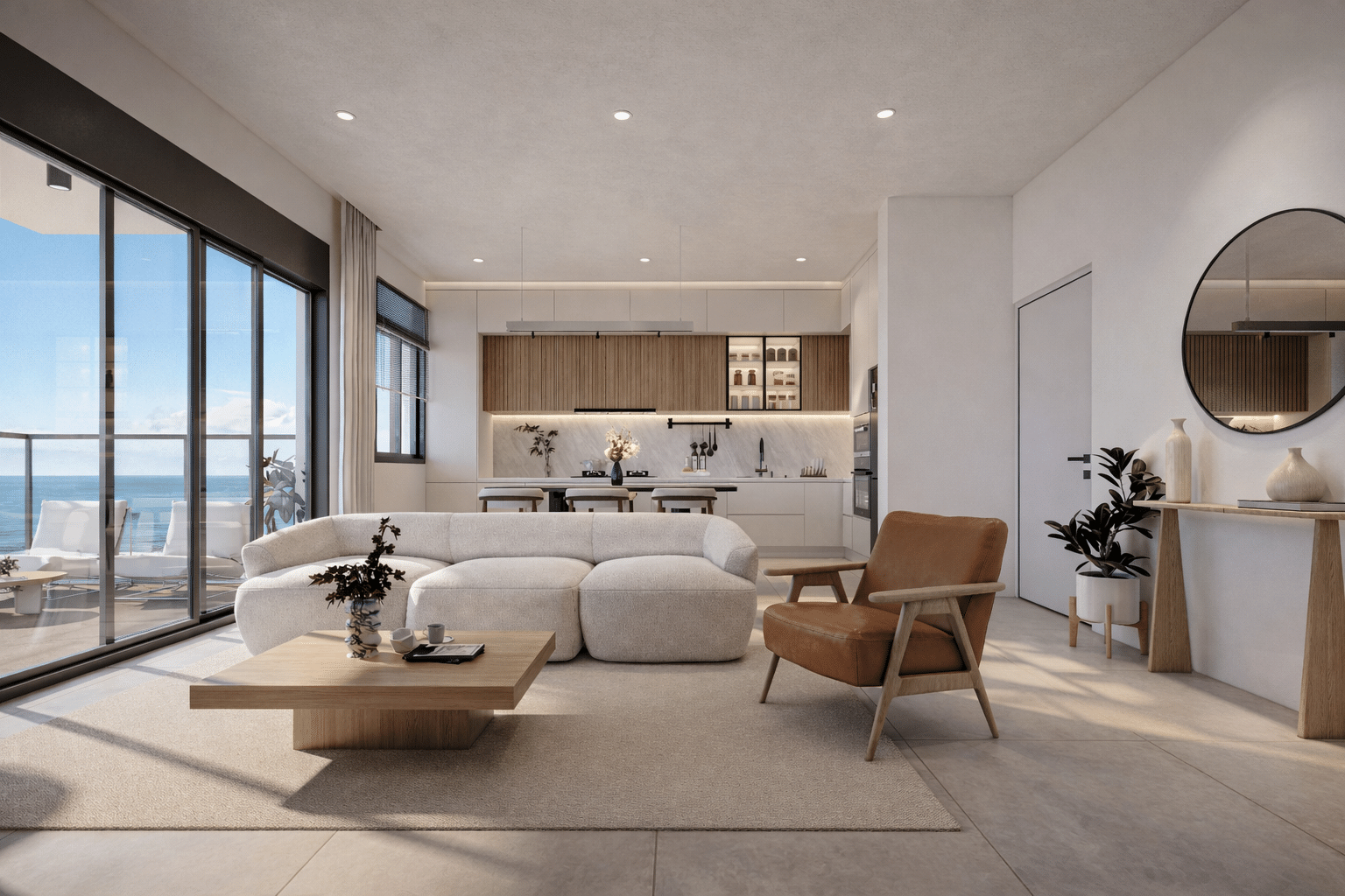 “עיצוב הפנים אשר בא לידי ביטוי ברופטופ ובלובי הפרויקט מציע שילוב הרמוני בין אנרגיה אורבנית לשלווה חופית, ושואב השראה מהקצב הטבעי של הים. קווים רכים וחומרים טבעיים יוצרים מעבר זורם בין שני המגדלים, והחצר המשותפת מעודדת קהילתיות וחיבור.