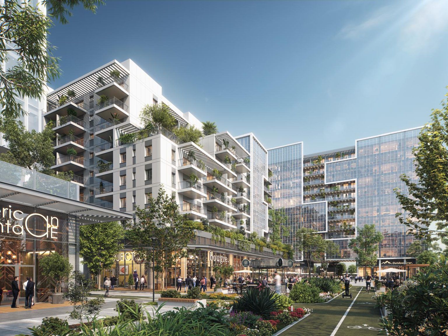 בבסיס הפרויקט מוקמת שדרת מסחר פעילה עם חנויות ובתי קפה, לצד שלוש קומות מרתף וחניון תת-קרקעי בשטח של כ-16,500 מ”ר.